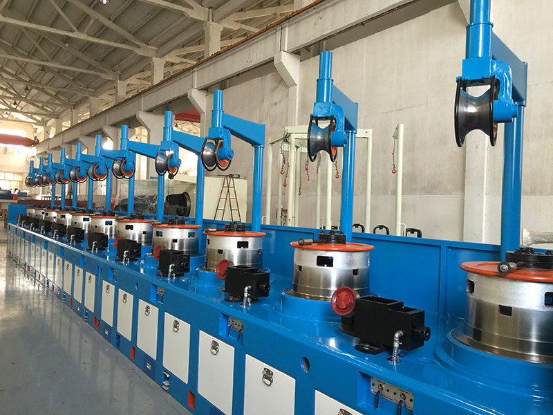 We are one of the earliest manufacturers of this wire drawing machine in China. It is mainly composed of gearbox, guider wheel of die box, stripper and electrical control system. In order to reduce the residual heat on the surface of capstan generated by the drawn wires, inner wall is equipped with cooling spray device. All dies are immersed in water to reduce the working temperature of dies. The pulley wire drawing machine has the following invention and utility patents: ‘Upper guide roller device’, ‘Damper stripper device’, ‘Double side low speed spindle’, ‘Lifting pulley structure’, ‘Dry drawing box part’, ‘Gearbox part’, etc.